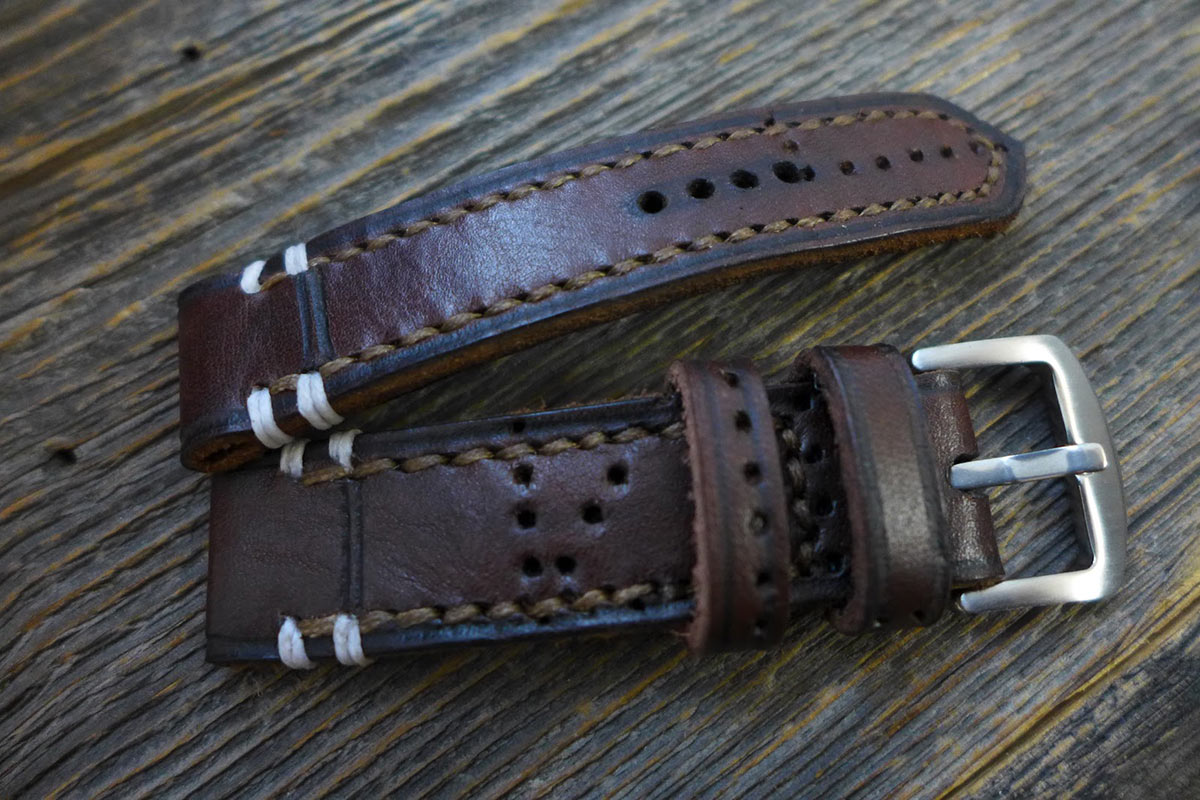 Bitte beachten: Bei den Bändern der true-ancient Vintage Line können immer mal wieder mehr oder weniger stark ausgeprägt alte original Nahtlöcher über das verwendete Leder laufen. Bitte Bescheid geben, falls das nicht erwünscht ist. Hier zwei Beispiele an den Ledern ''charcoal'' und ''walnut'' wie das mit diesen original Nahtlöchern aussehen kann.