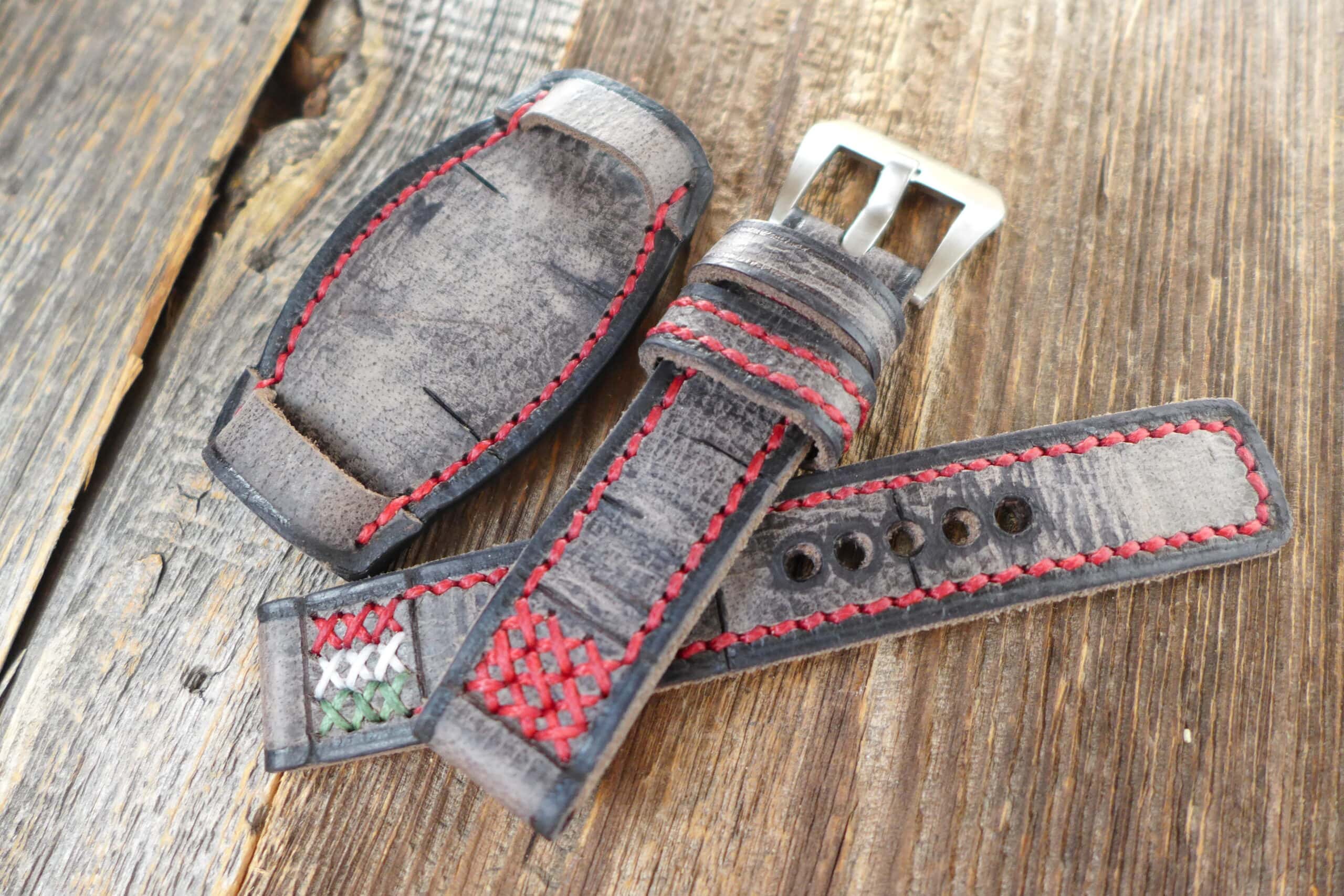 #1069 Wasserbüffel grau burned&aged Vintage Line (Sondermodell Bundstrap GP 1 – the oval one, Garn weiß & grün & dunkelrot)