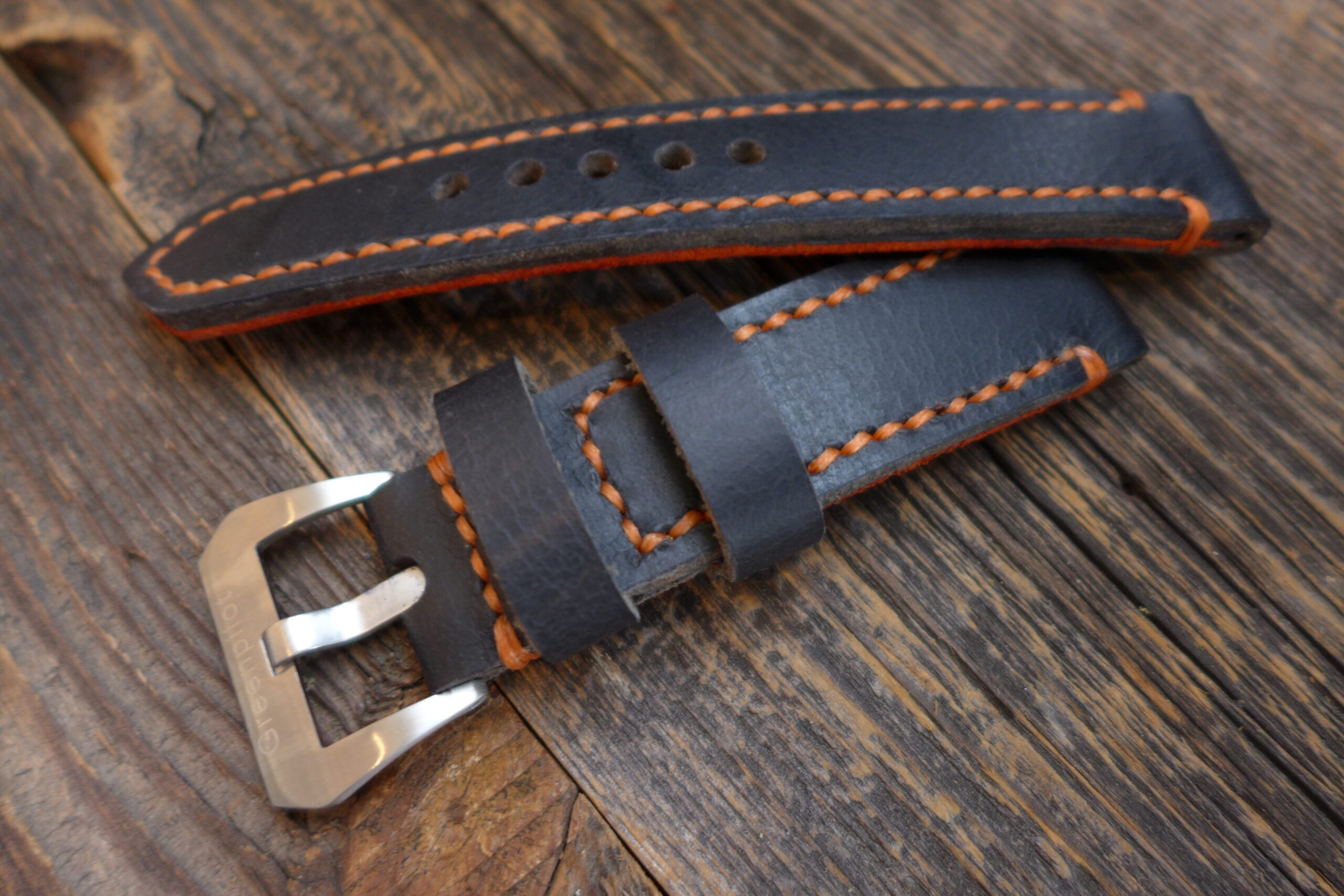 #1140 Wasserbüffel schwarz Solid-Line (Modell marine, Garn orange, Innenseite Leder orange rost)