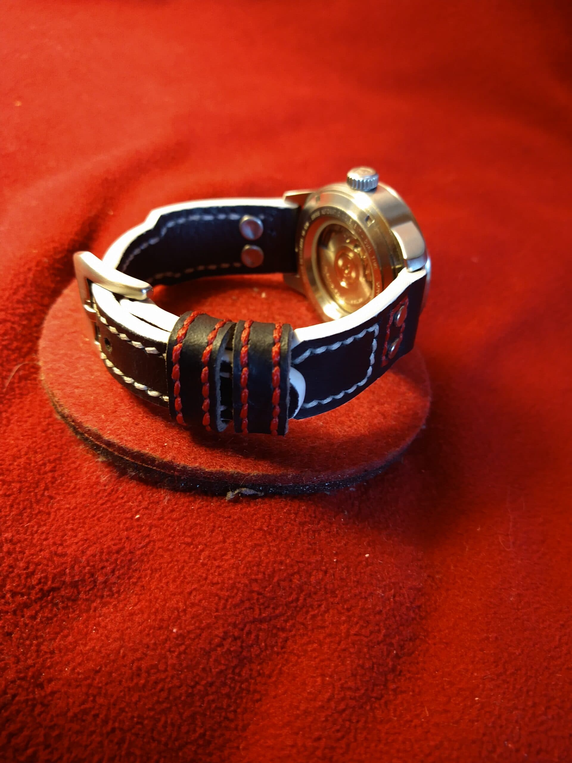 #1180 Wasserbüffel schwarz Solid-Line (Sondermodell Heritage Airman 2, Garn dunkelrot & hellgrau, Kantenfarbe hellgrau)