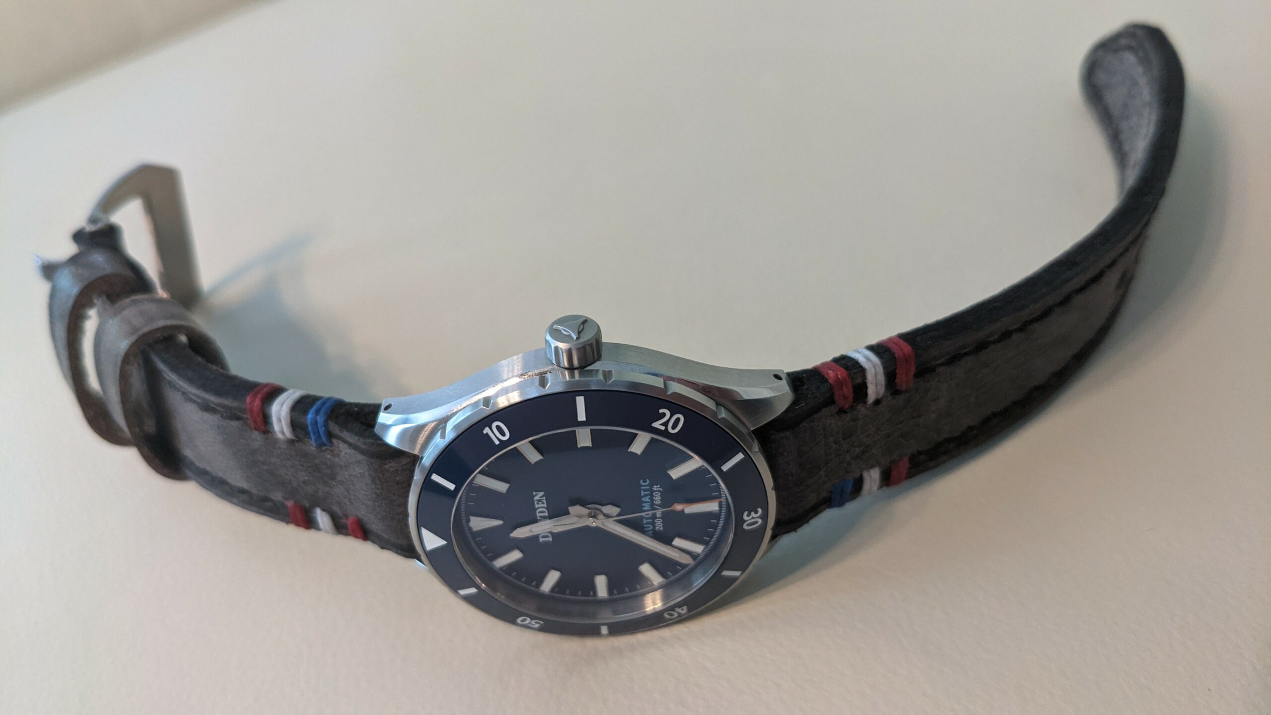 #1186 Wasserbüffel grau burned&aged Vintage Line (Modell marine (triple), Garn schwarz, weiß & dunkelrot & royalblau)
