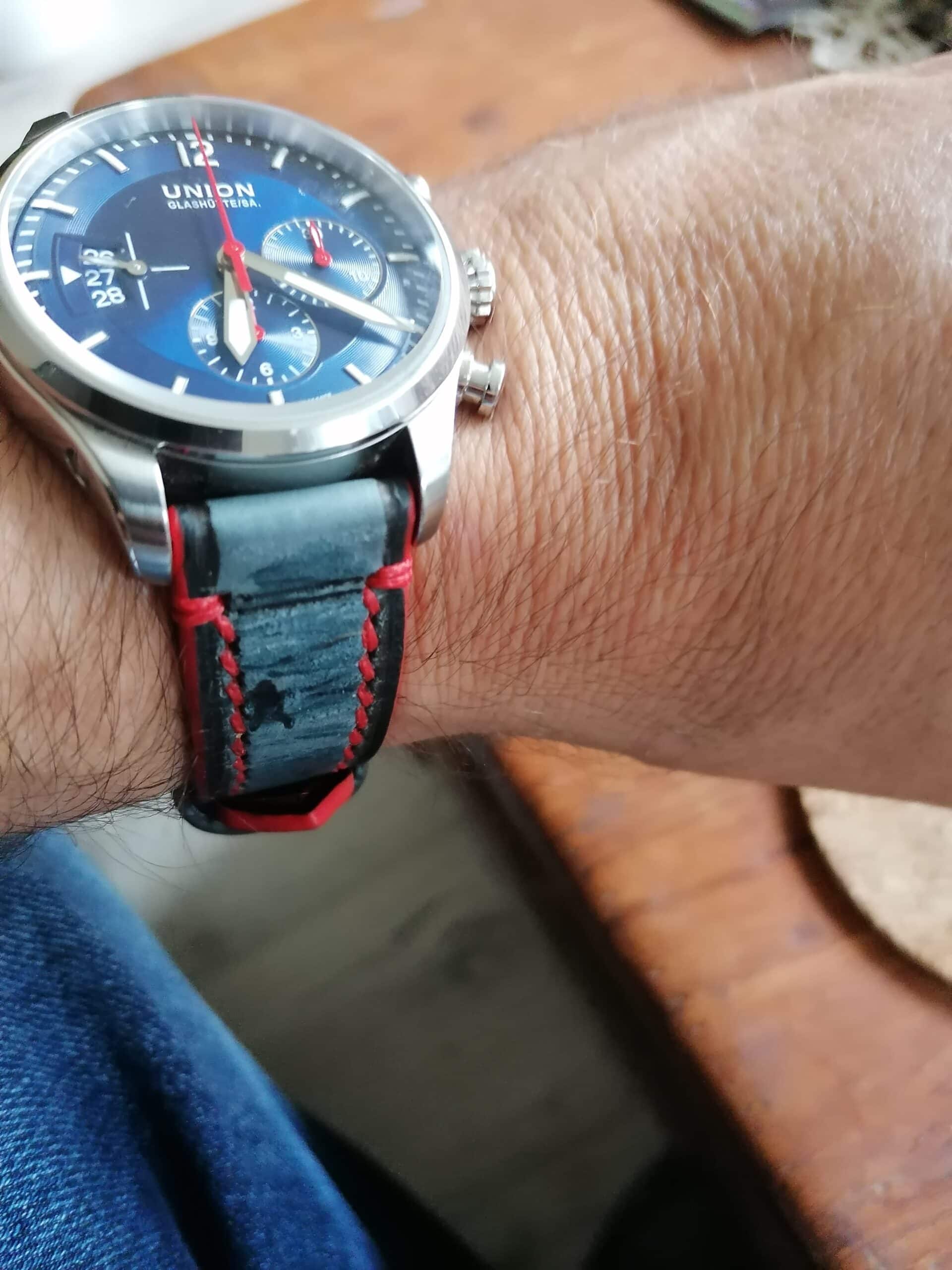#1194 schieferblau burned&aged Vintage Line (Modell marine, Garn rot leuchtend, Kantenfarbe rot)
