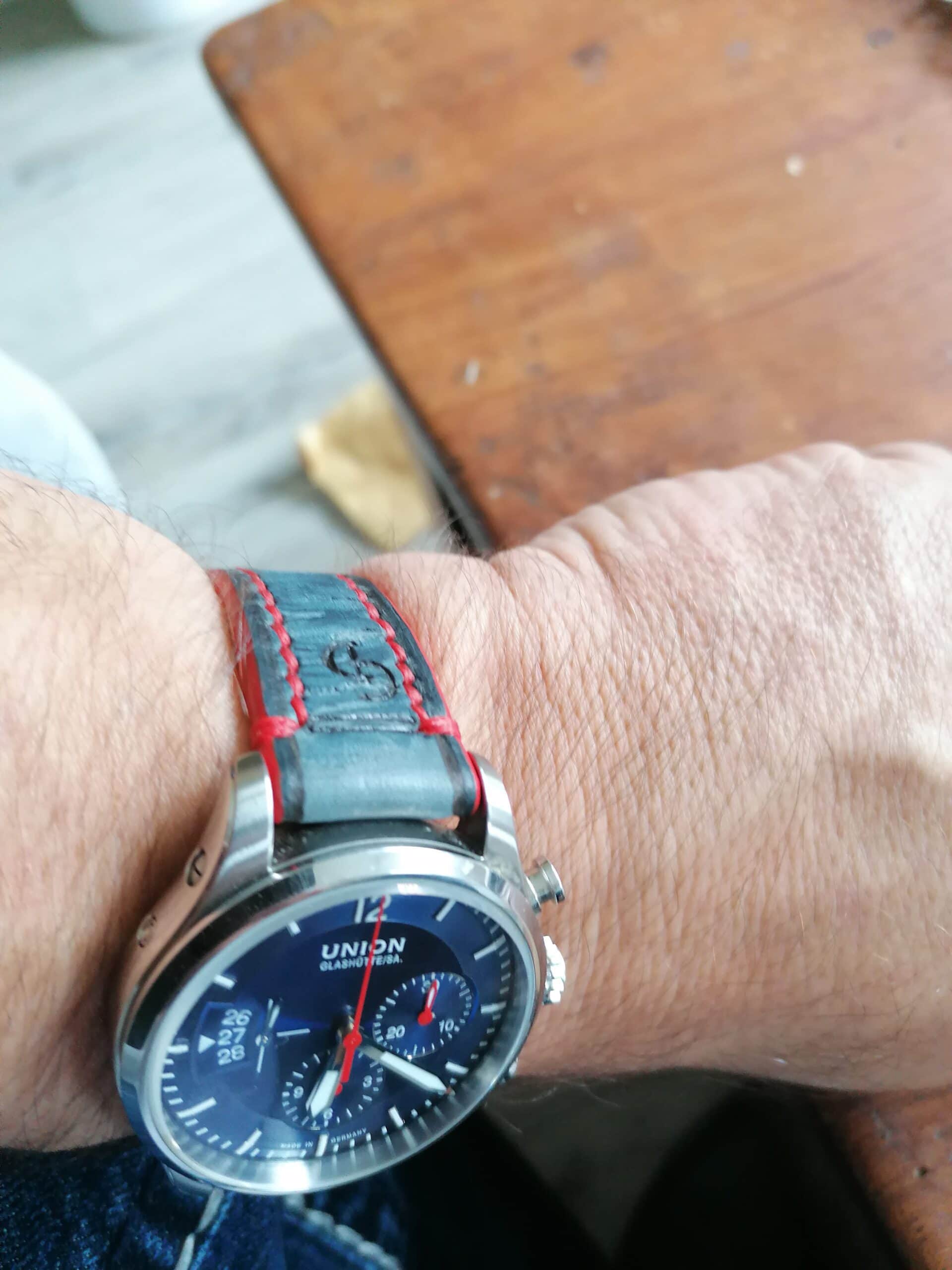 #1195 schieferblau burned&aged Vintage Line (Modell marine, Garn rot leuchtend, Kantenfarbe rot)