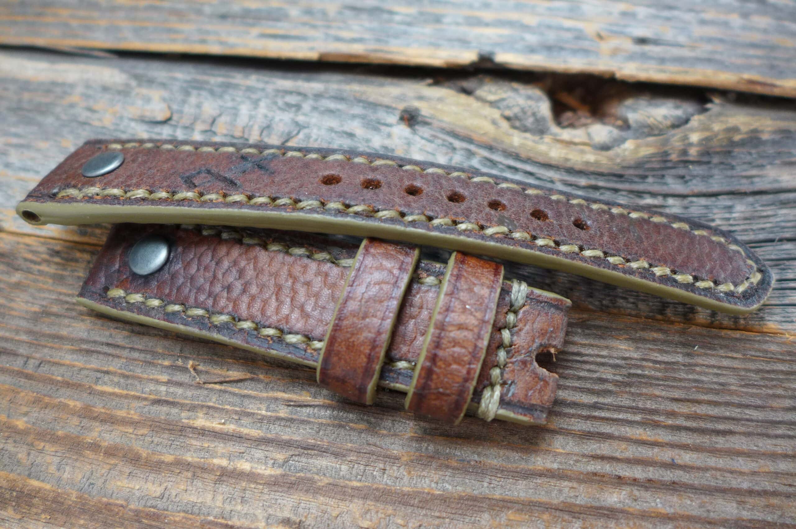 #1350 peat&smoke Vintage-Line (Sonderanfertigung, Modell open stitch mit Niete, Garn beige-ocker, Kantenfarbe beige-ocker)