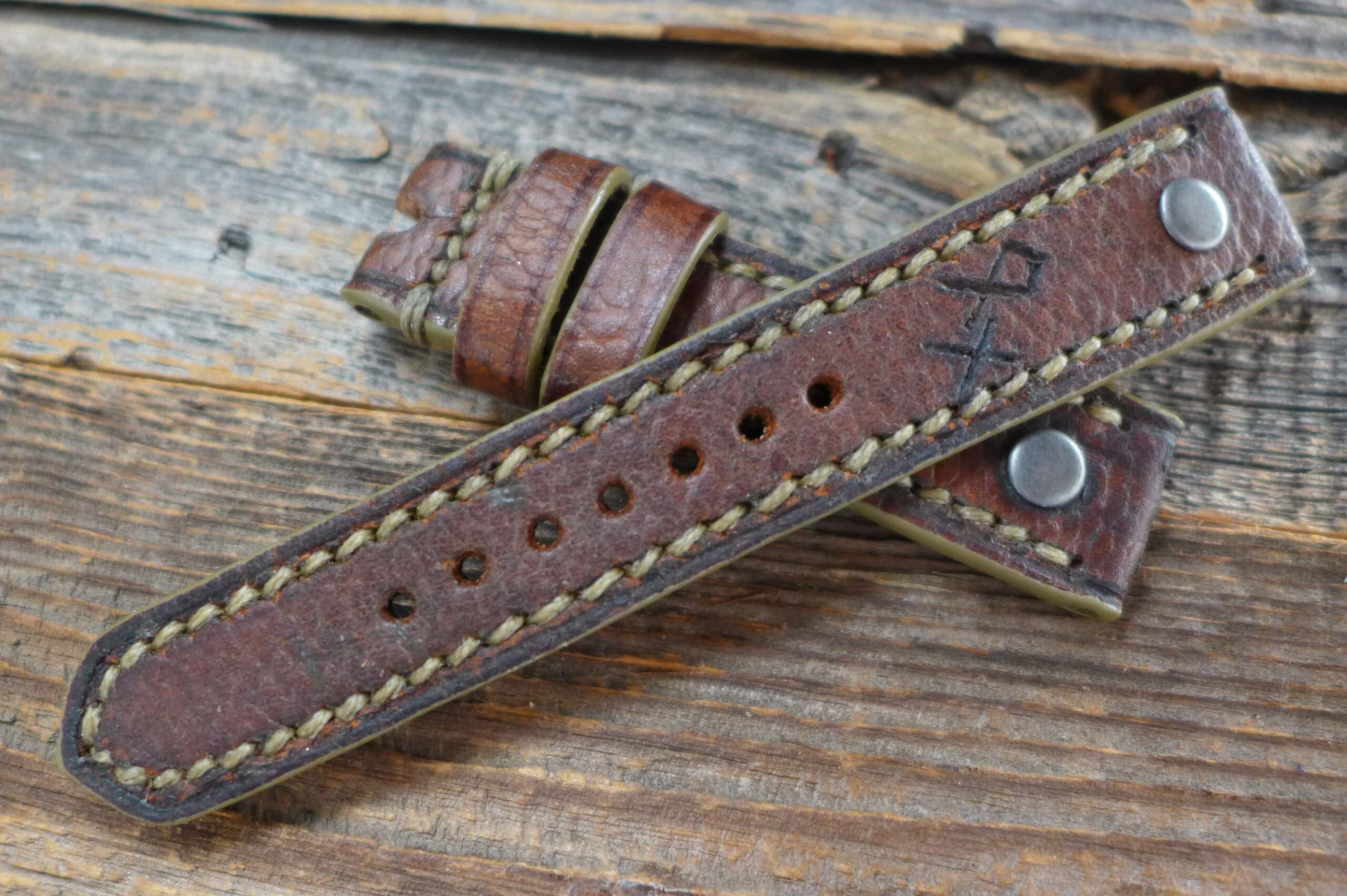 #1351 peat&smoke Vintage-Line (Sonderanfertigung, Modell open stitch mit Niete, Garn beige-ocker, Kantenfarbe beige-ocker)