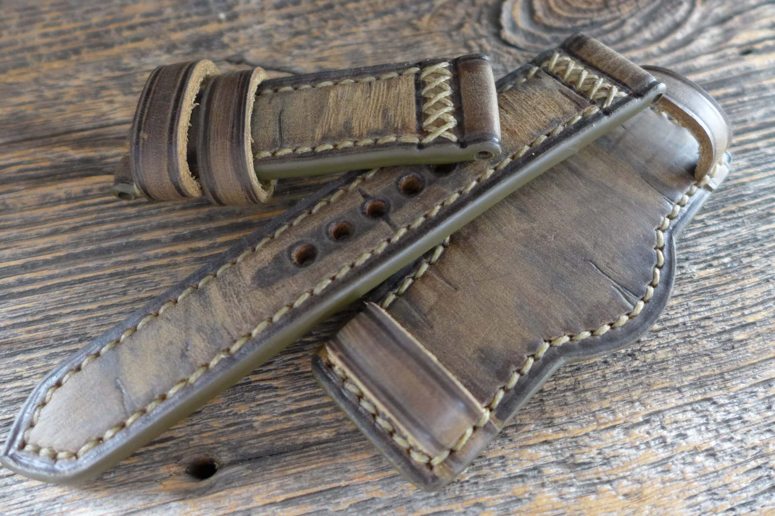 #1387 dunkel oliv-ocker burned&aged Vintage Line (Sondermodell Bundstrap GP 2 – the round one, Garn beige-ocker)