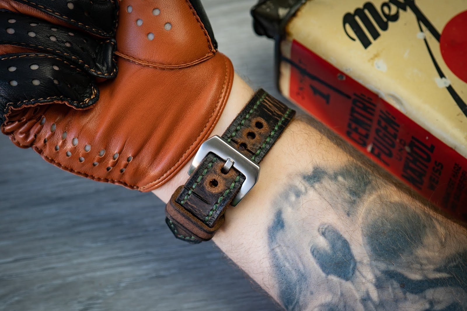 #836 Wasserbüffel dunkelbraun burned&aged (Modell closed stitch, maximale Schwärzung, Garn grün)