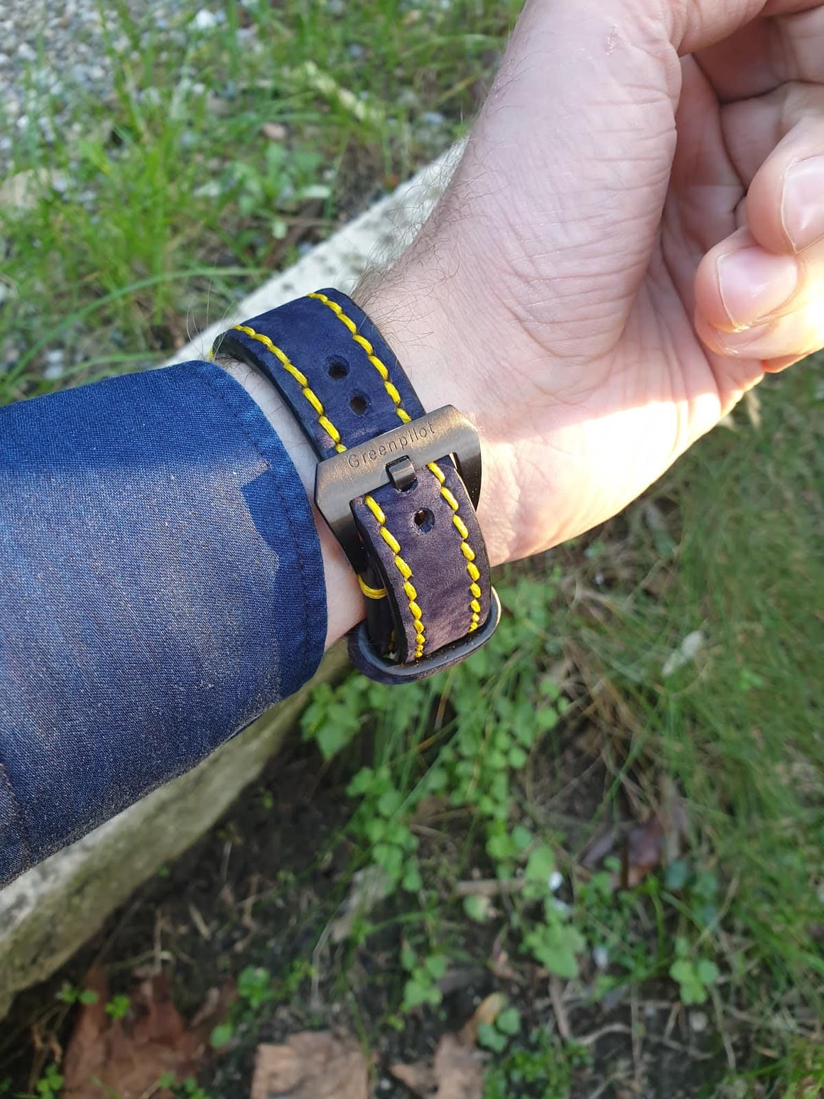 #849 black-blue denim Solid-Line (Modell u-turn, Garn signalgelb, Kantenfarbe dunkelblau)