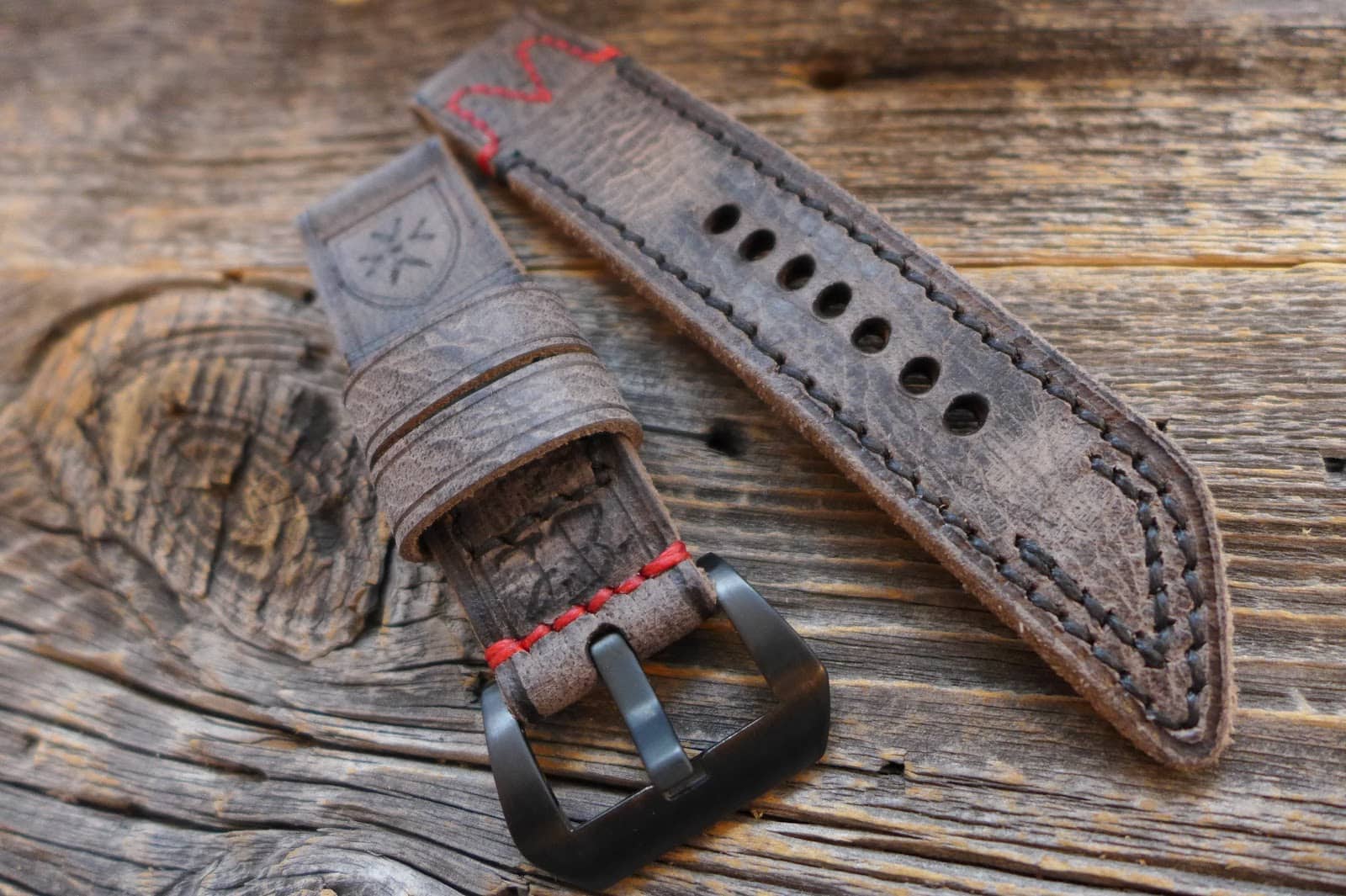 #884 Wasserbüffel grau burned&aged Vintage Line (Sonderanfertigung, Garn rot-leuchtend/schwarz)