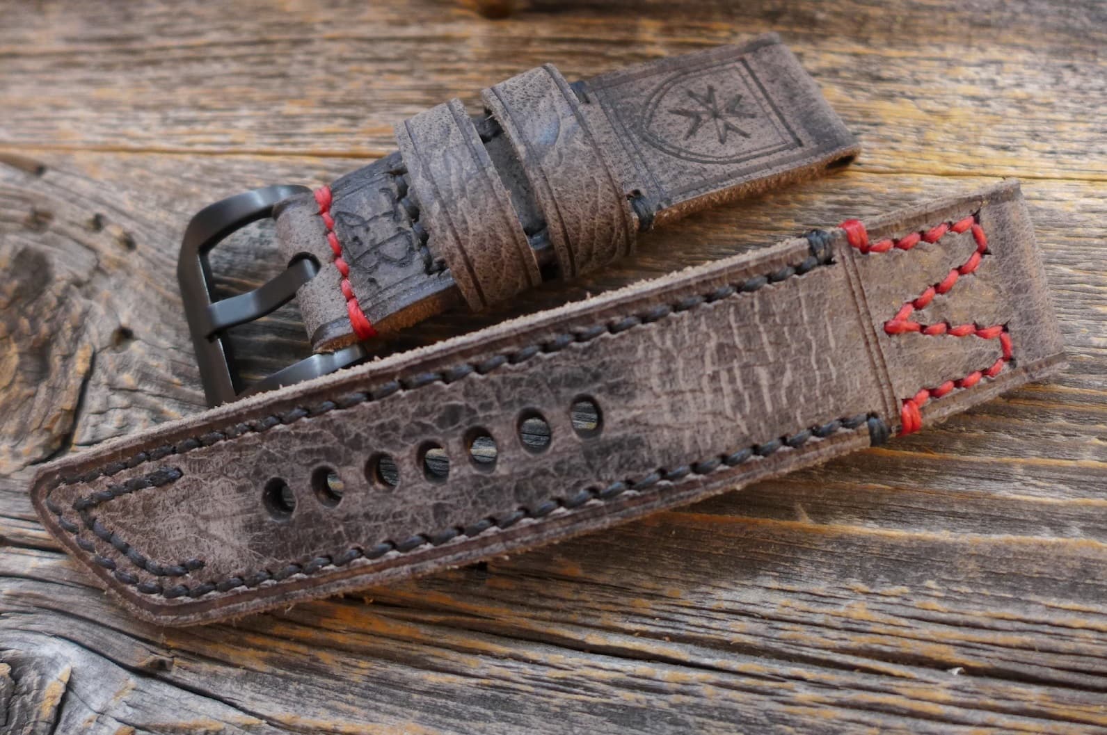 #885 Wasserbüffel grau burned&aged Vintage Line (Sonderanfertigung, Garn rot-leuchtend/schwarz)