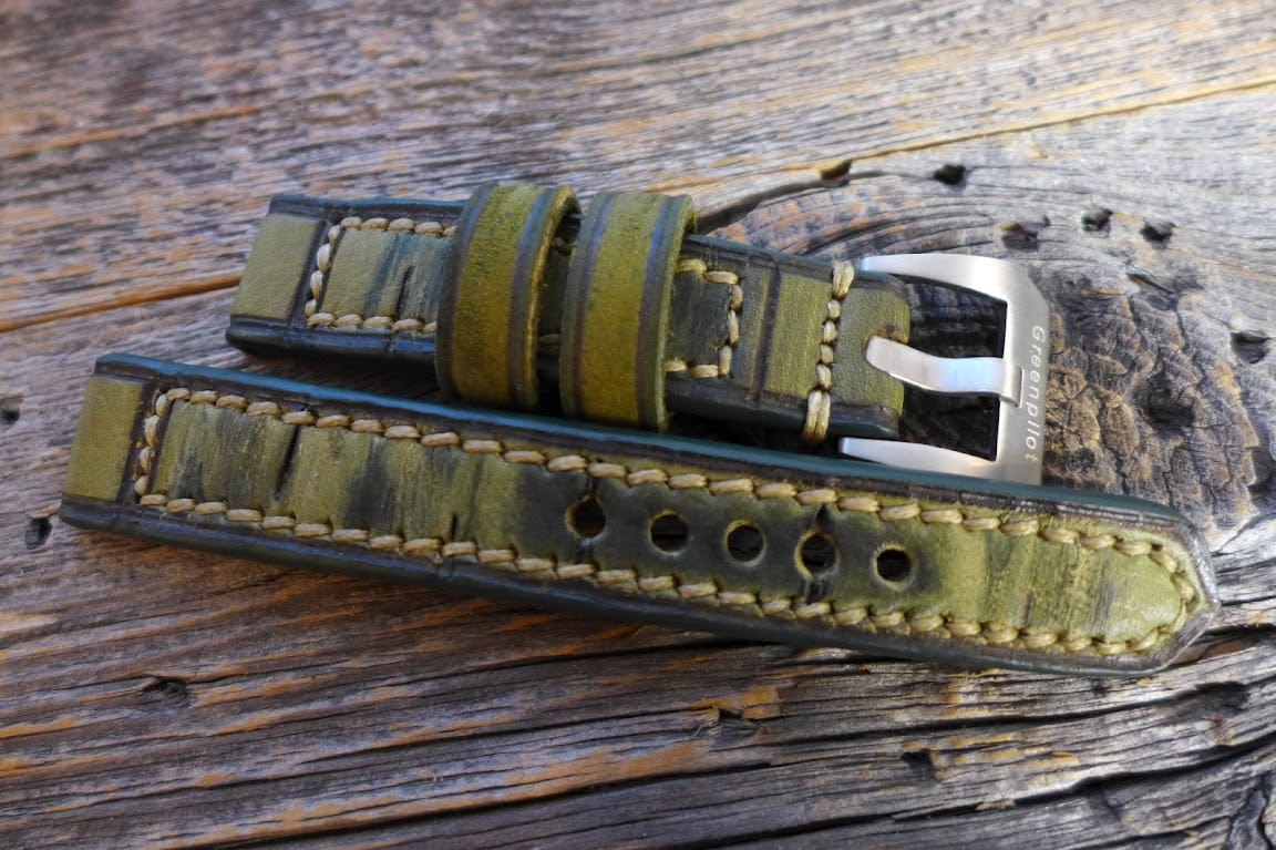#905 farngrün burned&aged Vintage Line (Modell closed stitch, Garn beige-ocker, Kantenfarbe dunkelgrün)