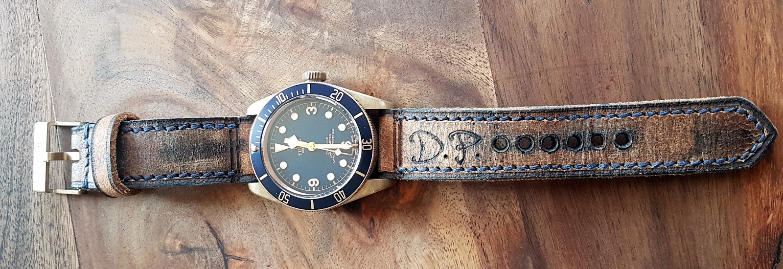 #910 Wasserbüffel hellbraun burned&aged Vintage-Line (Modell open stitch, Garn dunkelblau)