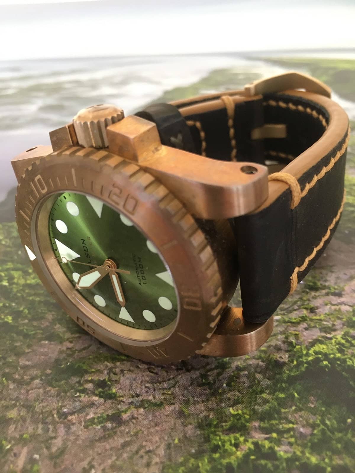 #916 military green Pullup Solid-Line (Modell marine, Garn senfgelb, Kantenfarbe bronze-braun)