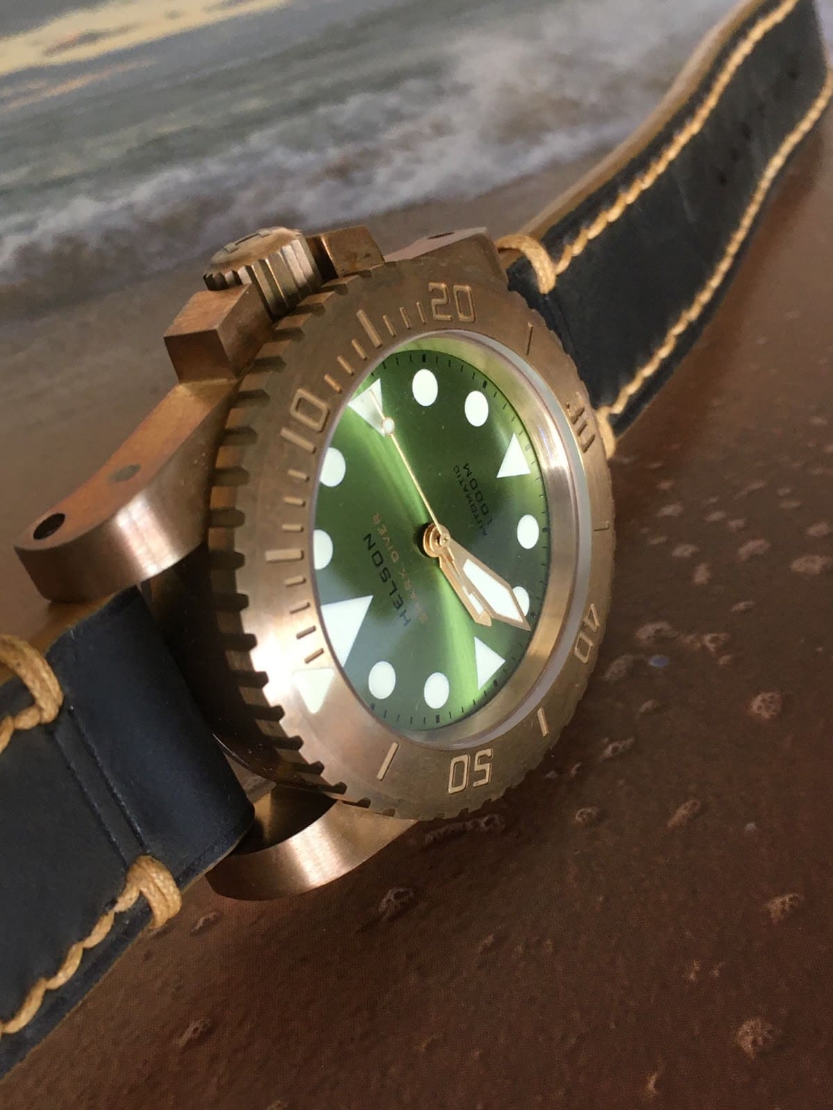 #917 military green Pullup Solid-Line (Modell marine, Garn senfgelb, Kantenfarbe bronze-braun)