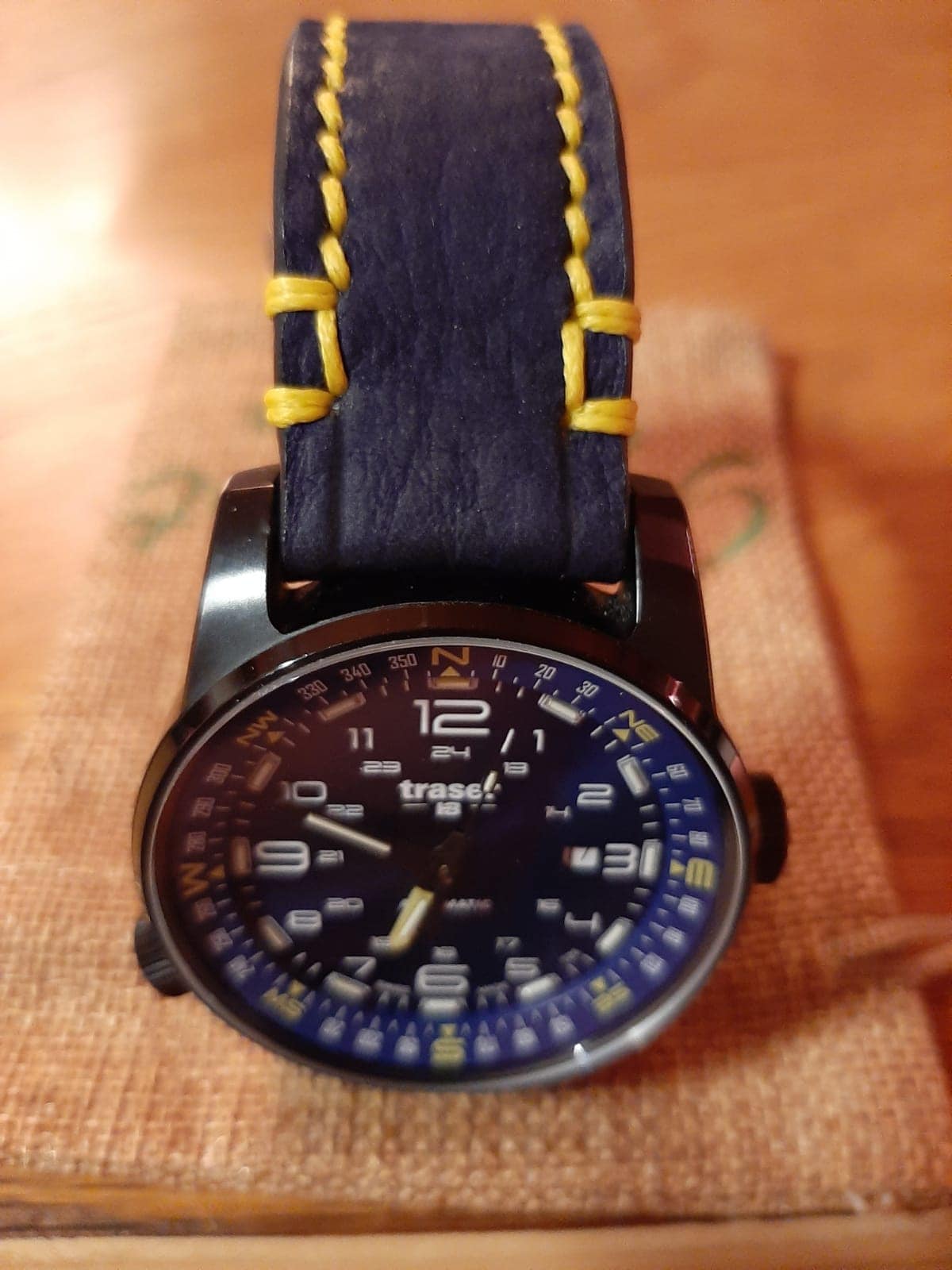 #935 black-blue denim Solid-Line (Modell u-turn, Kantenfarbe dunkelblau, Garn signalgelb)