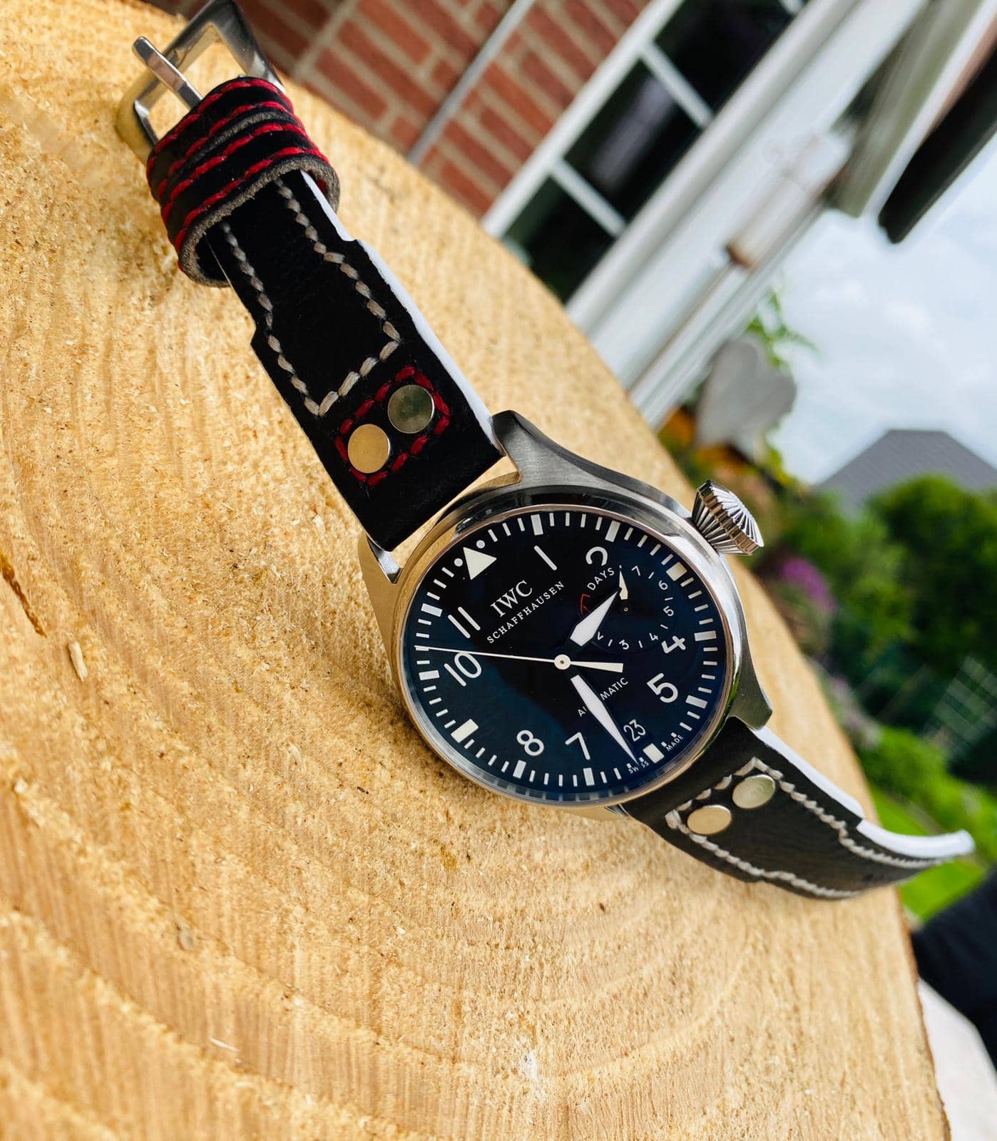 #977 Wasserbüffel schwarz Solid-Line (Sondermodell Heritage Airman 2, Garn dunkelrot & hellgrau, Kantenfarbe hellgrau)
